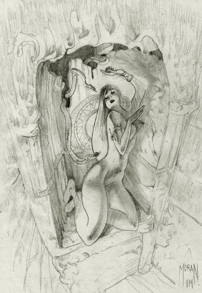 On this occasion we are transported to caves, temples and underground alcoves where the characters that I illustrate carry out the rites of incubation, quietism and shamanism. These ceremonies were the origin of metaphysical messages from that remote moment. The iatromantis or guardians of dreams have an important mediatory role somewhere between wakefulness and enlightenment that can suppose the intermediary states of consciousness, until reaching the deepest sleep. Peter Kingsley associates these experiences with the god Apollo and the famous (at least for him) and misinterpreted, Parmenides’ poem and his ‘trip to the underworld’.This trip, proposed by the pre-Socratic philosopher and reconsidered by the English writer, has been the cornerstone of the development of ‘Rituals’.