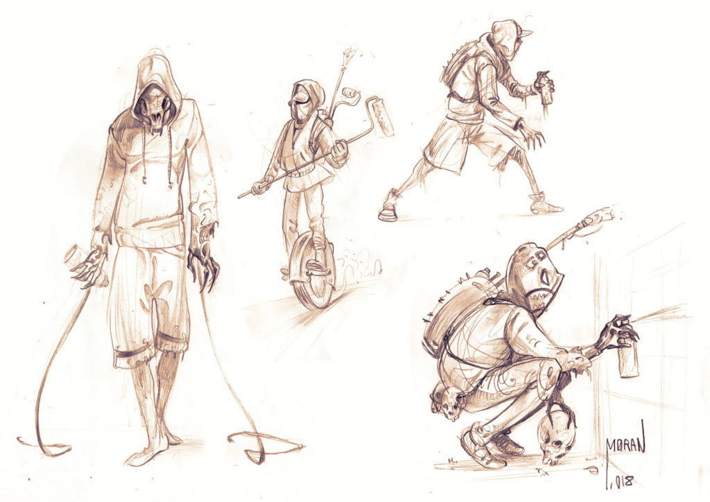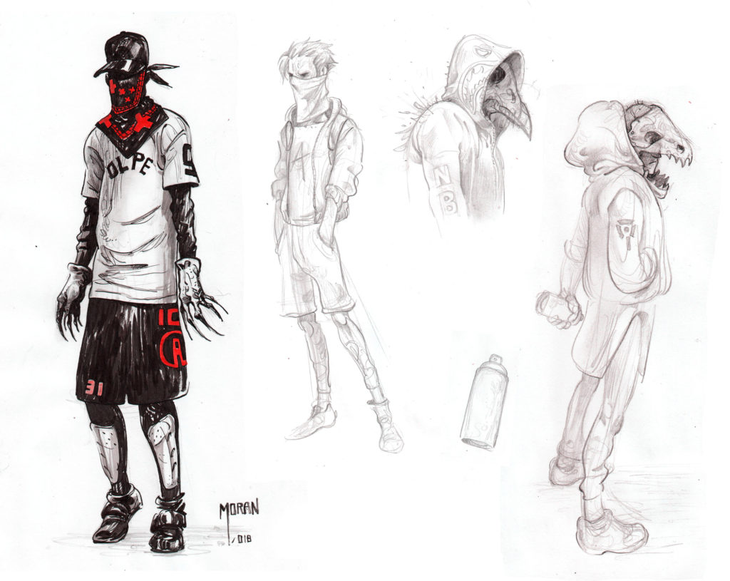 Algo que tuve muy claro es que los villanos irían encapuchados. Así, reforzaría el halo de misterio con sus atuendos juveniles de banda urbana.
